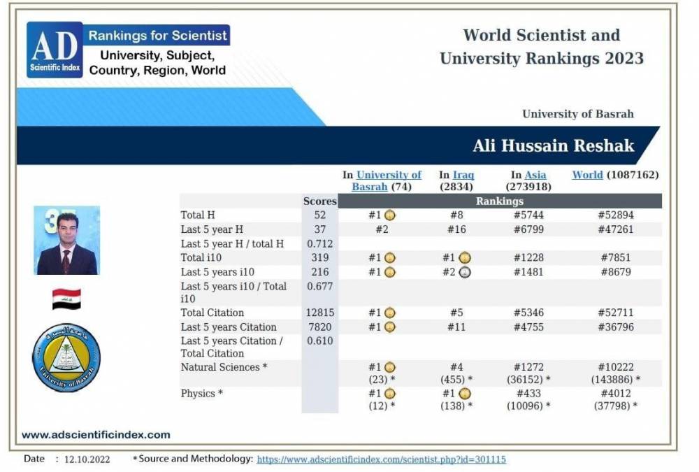 اختيار تدريسي من جامعة البصرة كاحد افضل الباحثين في العالم...