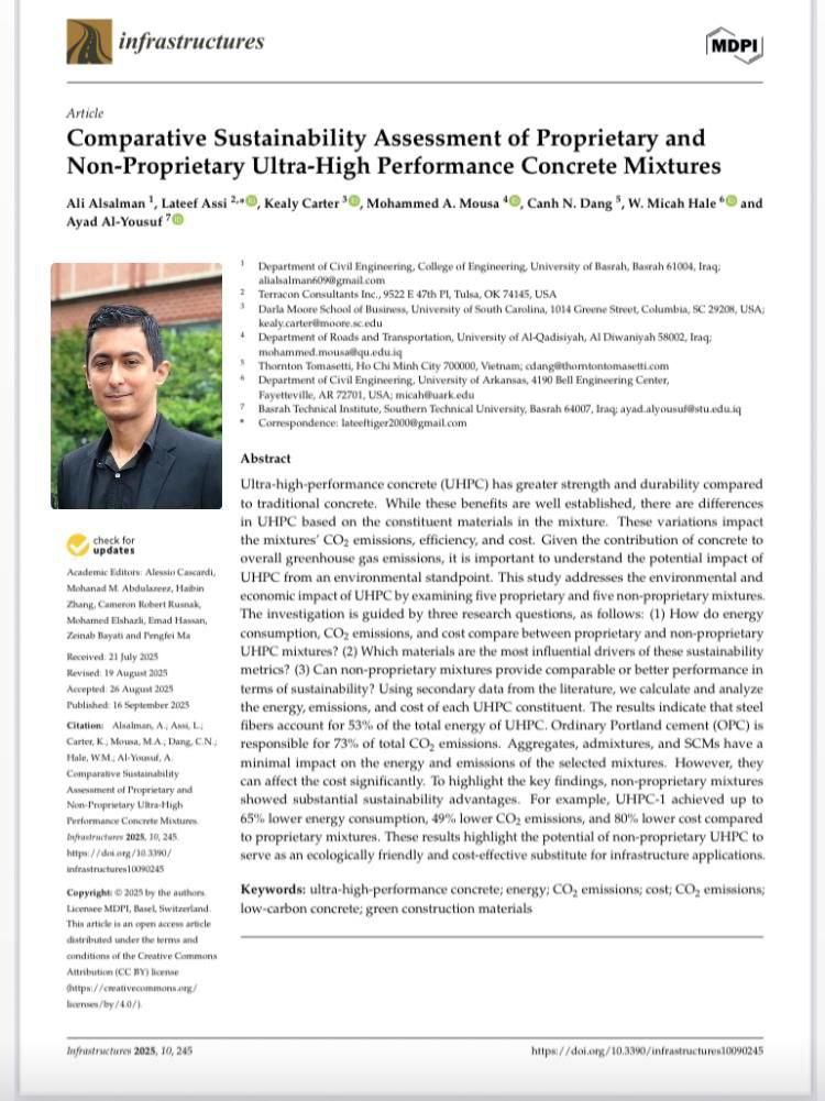 وبينت الدراسة التي تم نشرها في المجلة العالمية Infrastructures وهي ضمن الربع الأول Q1 من مستوعب Scopus. مقارنة استهلاك الطاقة، وانبعاثات ثاني أكسيد الكربون، والتكلفة بين الخلطات التجارية وغير التجارية، وتحديد المواد الأكثر تأثيرًا في مؤشرات الاستدامة.