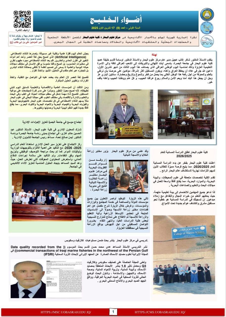 اصدرت جامعة البصرة العدد الثامن من النشرة الشهرية "أضواء الخليج"، والتي تُعنى بالقضايا البحرية والدراسات المتعلقة بمنطقة الخليج العربي.
