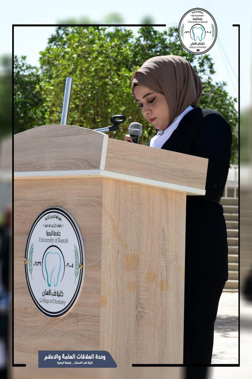 والقى خلال الحفل الدكتور علي طه كلمة العمادة هنئ بها منتسبي جامعة البصرة ومجد من خلال كلمته جامعة البصرة ودورها الفعال في خدمة المجتمع.