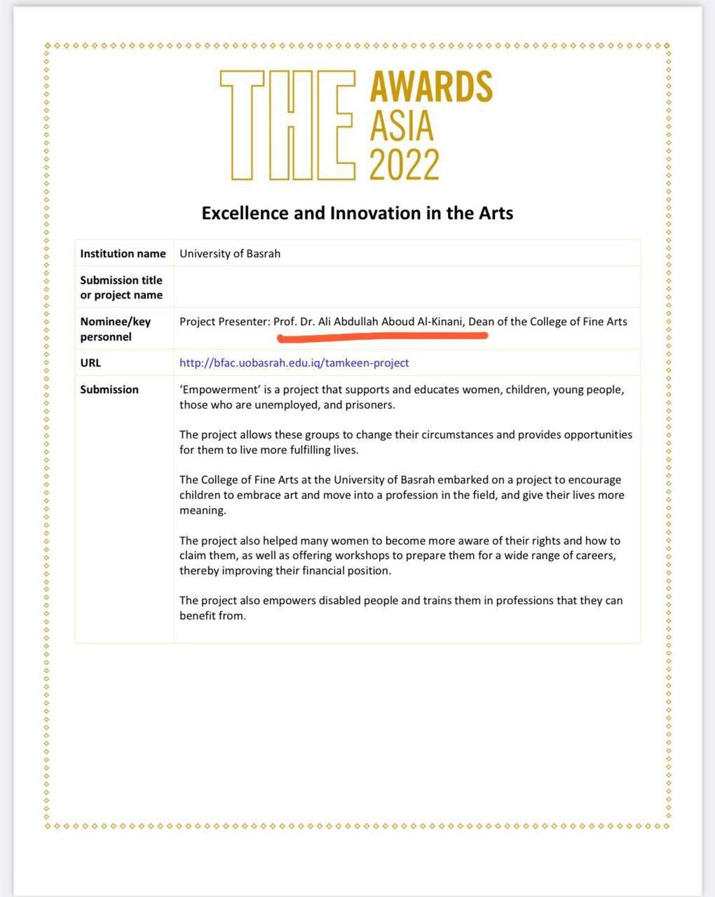 رشحت كلية الفنون الجميلة في جامعة البصرة ضمن افضل ثمان كليات في العالم في تصنيف (THE) لحصد جوائز الاوسكار في التعليم العالي متصدرة على كبرى جامعات العالم .