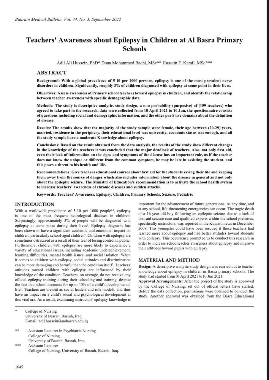نشر فريق بحثي في كلية التمريض بجامعة البصرة بحثا علميا في مستوعب سكوبس برئاسة الدكتور عادل علي حسين والباحثة دعاء محمد باجي والباحث حسين فاخر كامل من نشر بحث علمي عن وعي معلمي المدارس الابتدائية حول الصرع عند الاطفال في مدينة البصرة في المجلة البحرينية