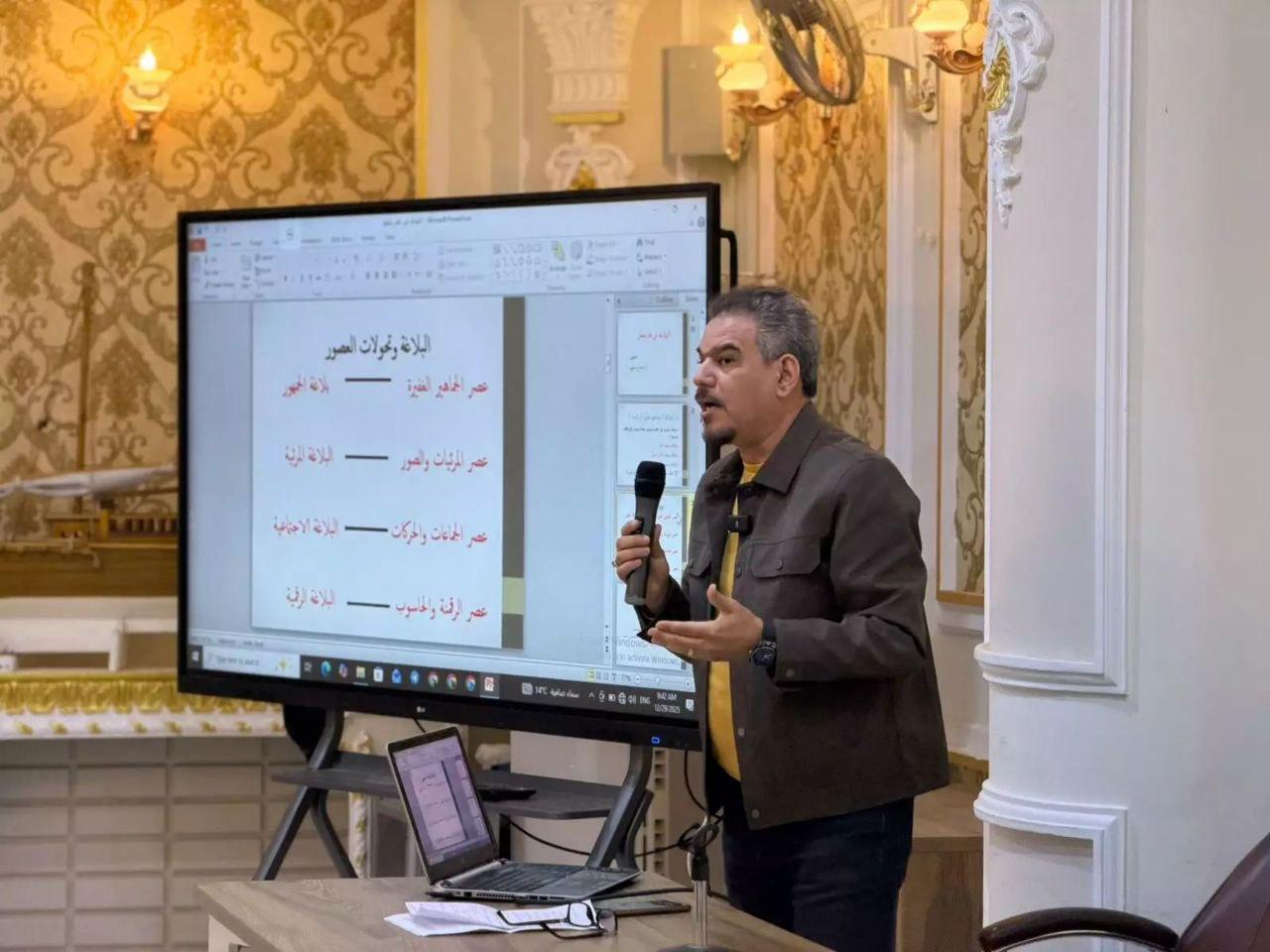 وتضمنت الورشة محاضرة قدمها التدريسي في الكلية الدكتور صلاح حسن حاوي ناقش خلالها نماذج ارشادية لفهم العلاقة بين المتغيرات الحديثة والتوجهات البلاغية الجديدة بوصفها علماً متجدداً يتفاعل مع الواقع الثقافي والتقني والاجتماعي.