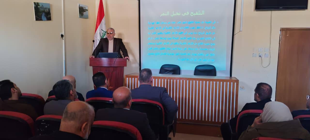 نظم مركز أبحاث النخيل في جامعة البصرة محاضرة علمية بعنوان (المحتوى الكيميائي والهرموني لحبوب لقاح الأصناف الذكرية المختلفة في العمر وتأثيرها على نسبة النضج في ثمار نخيل البرحي النسيجي).