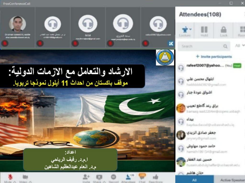 أقام مركز التطوير والتعليم المستمر في جامعة البصرة، وبالتعاون مع كلية التربية للبنات، ندوة إلكترونية بعنوان الإرشاد والتعامل مع الأزمات الدولية (موقف باكستان من أحداث 11 أيلول أنموذجاً تربوياً)، بمشاركة عدد من الطلبة والمهتمين.