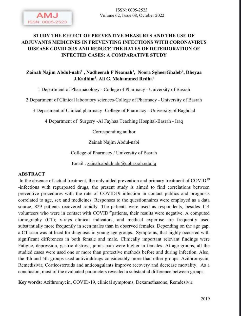 نشر التدريسيون في كلية الصيدلة بجامعة البصرة المدرس زينب نجم عبدالنبي والدكتور نظيرة فالح نعمة والمدرس نورة صغير غالب بحثاً بعنوان (دراسة تأثير طرق المنع واستعمال الادوية المساعدة في منع الاصابة بمرض الكورونا وتقليل معدلات تدهور الحالات المصابة :دراسة مقارنة) في المجلة الطبية الأذربيجانية ذات معامل التأثير:0.067وضمن مستوعبات سكوبس.