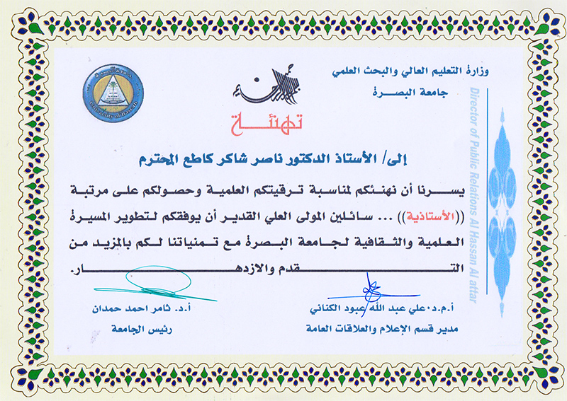 تهنئة الى الأستاذ الدكتور ناصر شاكر كاطع المحترم ...