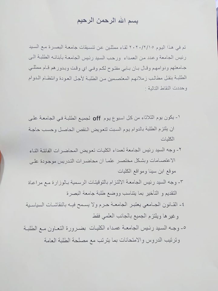 الطلبة المعتصمون في جامعة البصرة يقرورن العودة للدوام غدا الأحد بعد اللقاء مع رئاسة الجامعة ...